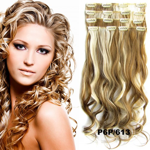 Clip in vlasy, sada 7 - mi pásov hodvábnych vlnitých vlasov na clip in sponkách s dĺžkou 45 cm, v melíre tmavo plavé v beach blond 6P/613.