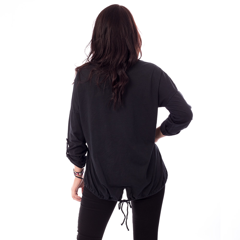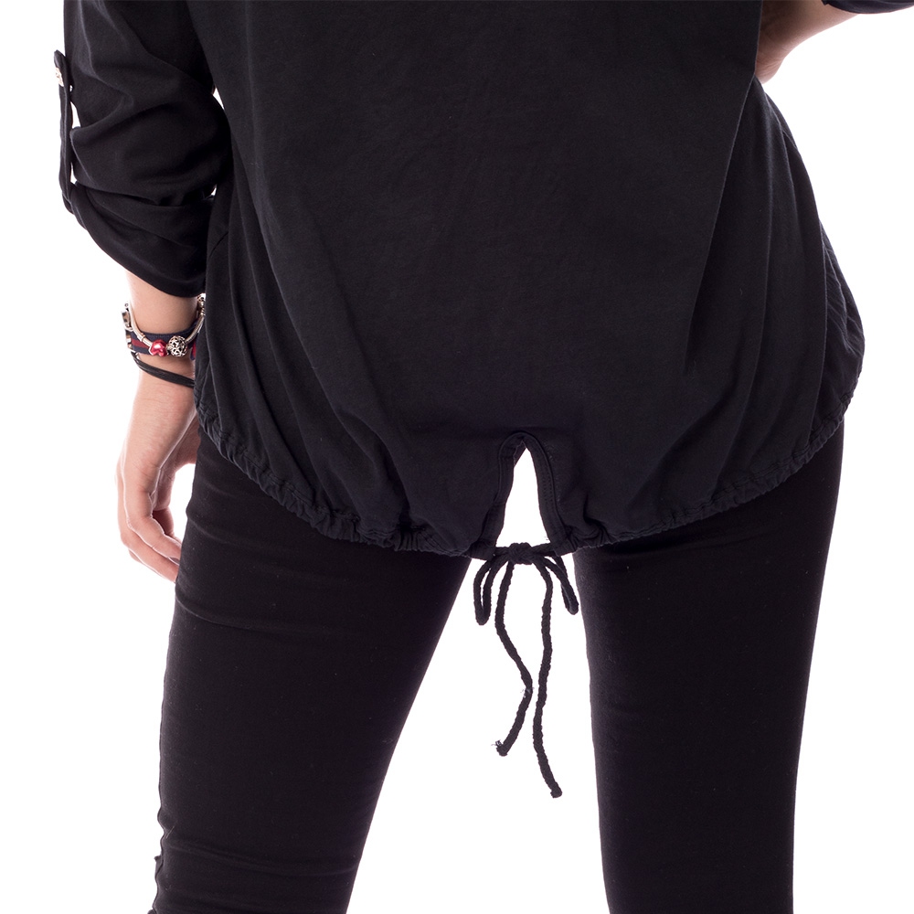 Štýlová čierna mikina s predĺženým zadným dielom na stiahnutie.