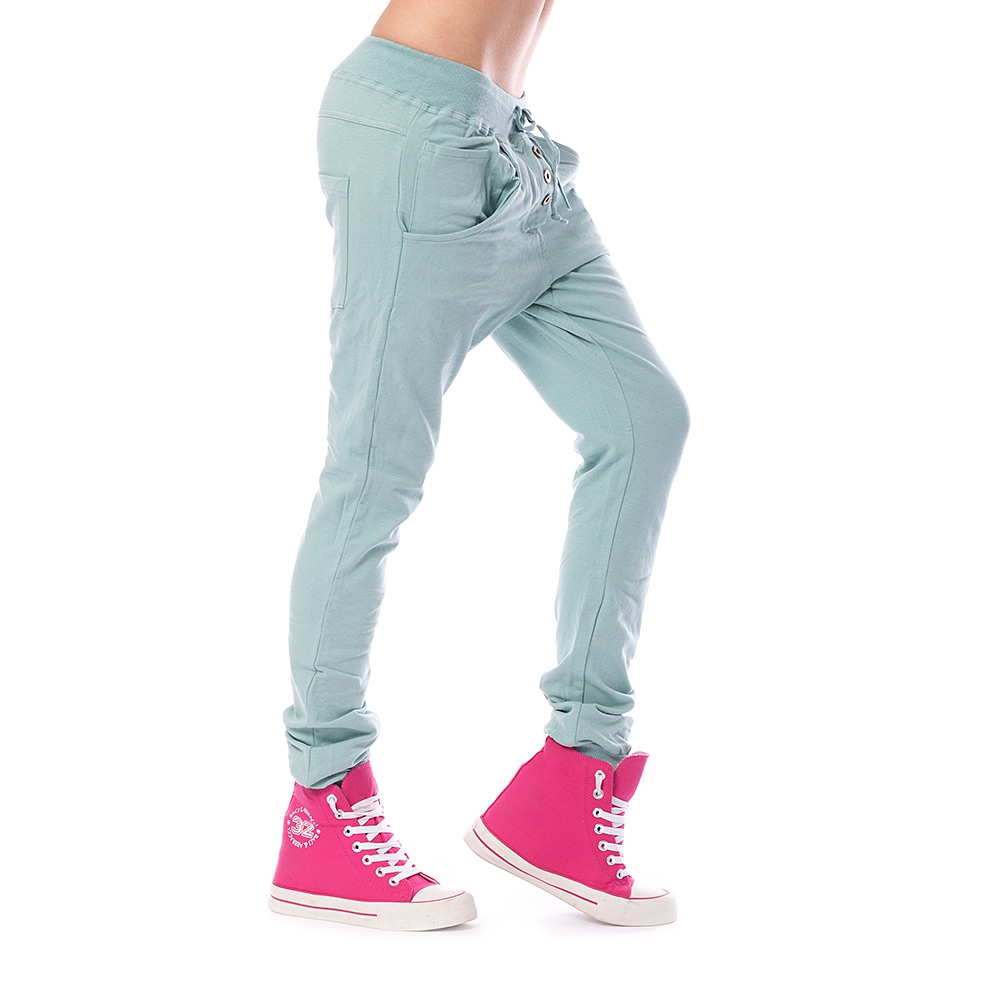 Dámske háremové nohavice vo svetle zelenom pastelovom odtieni.