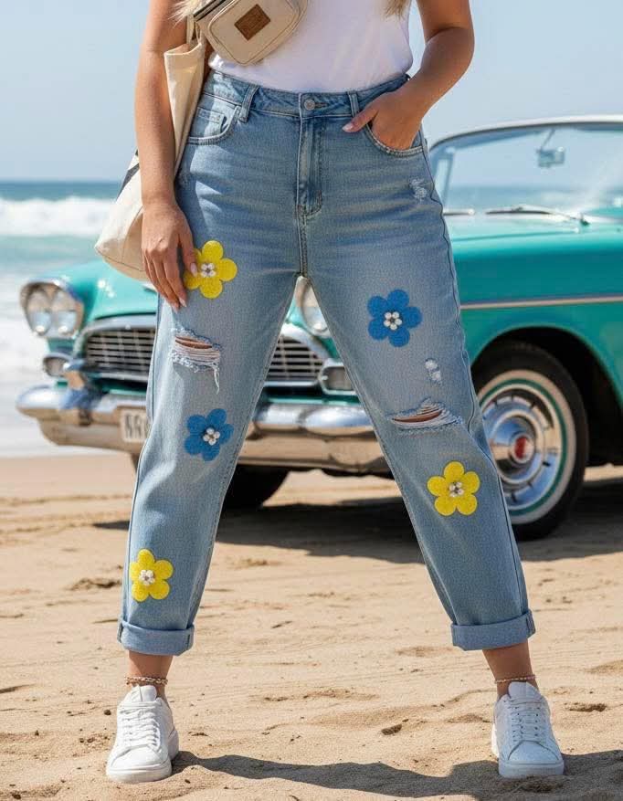 Moderné dámske džínsy s aplikáciou kvetov, sú našim top kúskom.
