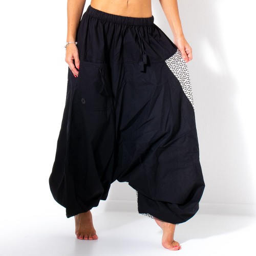 Ľavú stranu nohavice zdobí originálna digitálna tlač s motívom lietajúcich netopierov z dielní popredných amerických návrhárov. V páse sú haremky na gumu, to znásobuje komfort ich nosenia. V prípade potreby je možné haremky v páse stiahnuť šnúrkou. Na pravej strane predného dielu je praktické vrecko. Gumičky v spodnej časti nohavíc umožňujú využiť nohavice pri podkasanie tiež ako sukňu. Celé nohavice sú ušité preplátavaným švy, čo zaručuje ich pevnosť, dlhšiu trvanlivosť a nemožnosť štiepeniu švov.