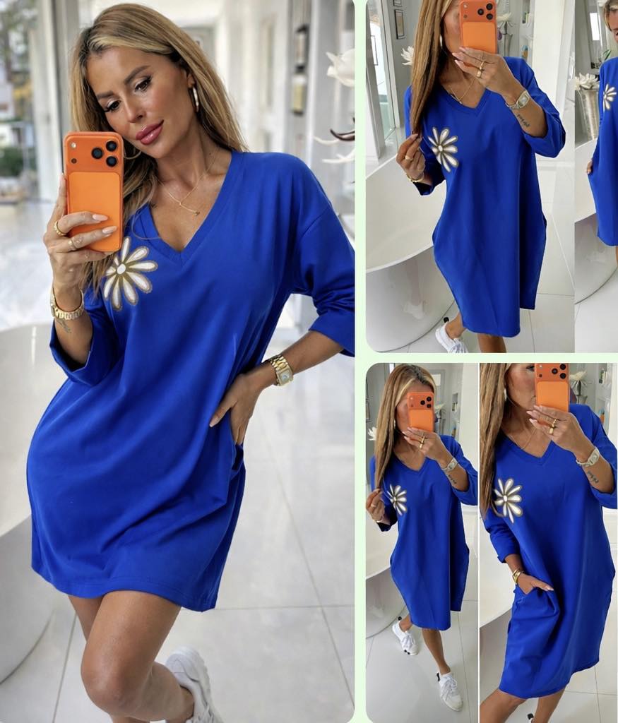 Dlhá šatovka a plieškom a vreckami v modrej farbe