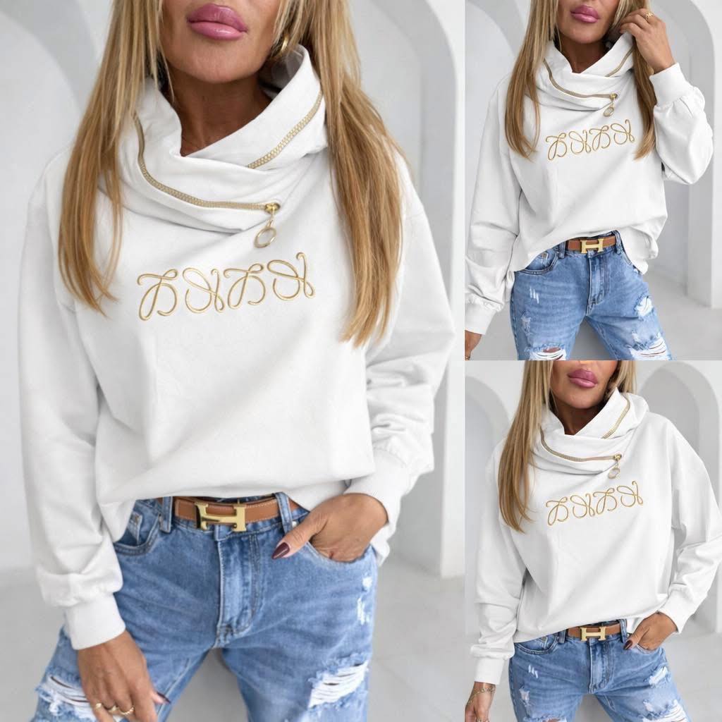 Nádherná dámska mikina so zvýšeným golierom a zlato vyšitým nápisom, je skvelý kúsok do moderného šatníka.